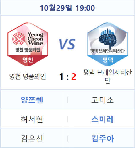 승부는 마지막 3국에서 갈렸다. 평택의 김주아가 영천의 김은선을 상대로 초반 불리한 형세를 극복하고 역전승을 거두며 팀의 2-1 승리를 완성했다. 초반 불리한 흐름으로 시작한 김주아는 중반 하변 접전에서 결정적인 득점을 올리며 판세를 자신의 흐름으로 가져왔다. 이후 단 한 번의 기회도 허용하지 않으며 우세를 지켜내며 자신의 손으로 팀 승리를 확정 지었다.